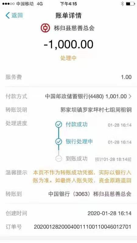 1月28日晚,在村里人的帮助下,周老成功给秭归县慈善总会捐款1000元,他说:“钱不多,能帮助政府缓解一点儿,总是好的啊。”
