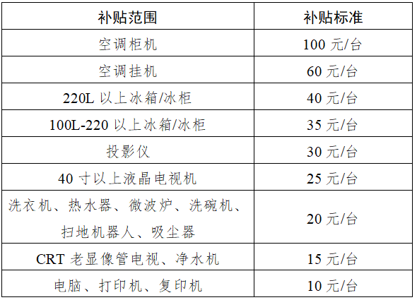 符合条件的补贴产品包括空调、电视机、投影仪、冰箱冰柜、洗衣机、吸油烟机、燃气灶、热水器、微波炉、洗碗机、电饭煲、净水器、空气净化器、扫地机器人、吸尘器、智能门锁、智能马桶17类商品。产品须在中国效能或水效标识网备案达一、二级能效,具有统一的国标13位商品编码。