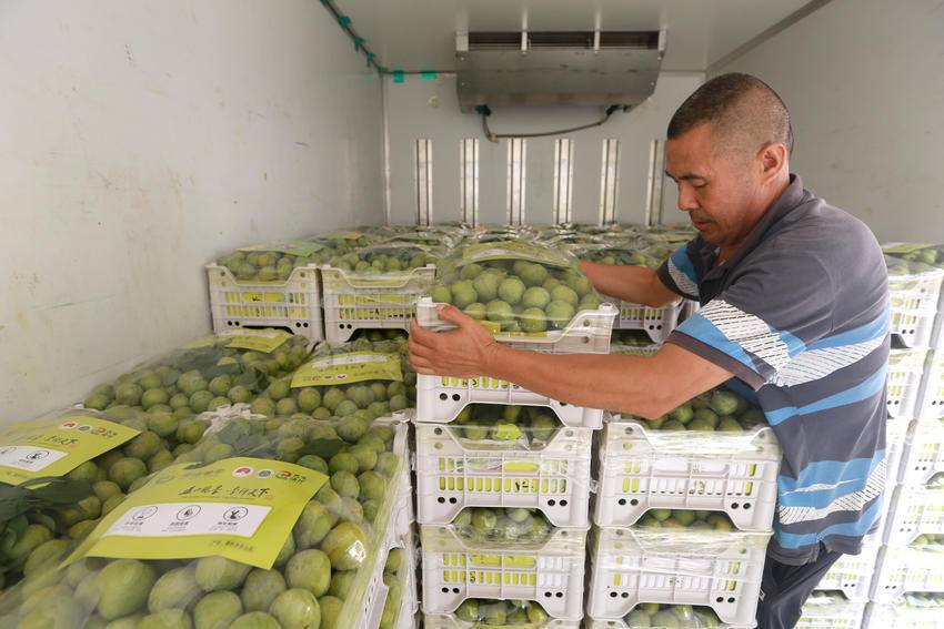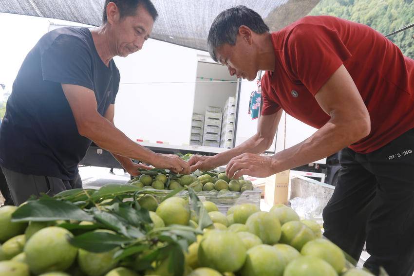 7月12日,秭归县沙镇溪镇高潮村村民将包装好的空心李装车。