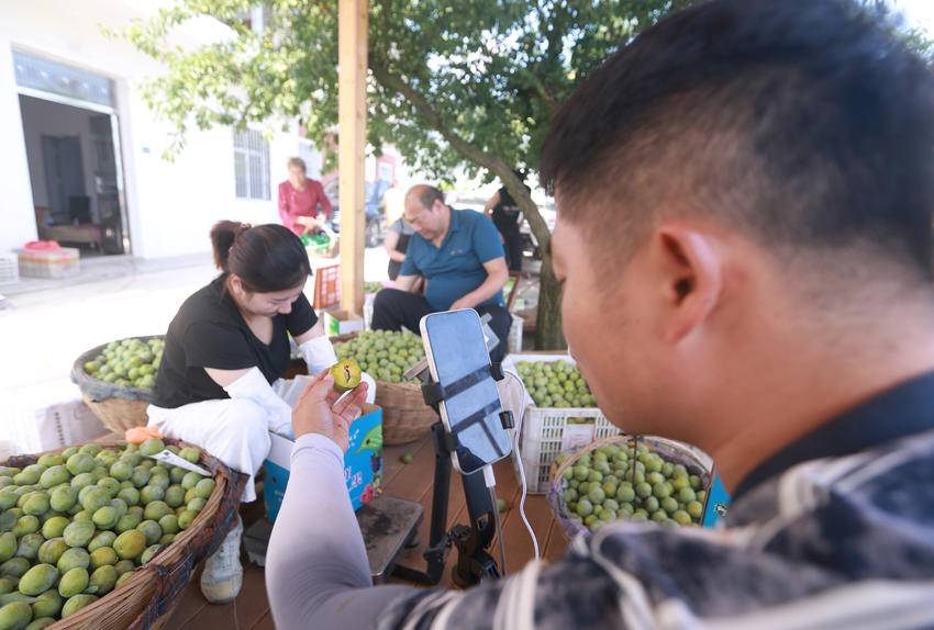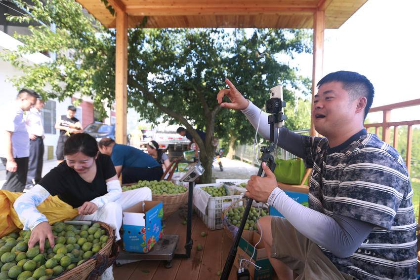 7月12日,电商主播在秭归县沙镇溪镇高潮村带货直播销售空心李。