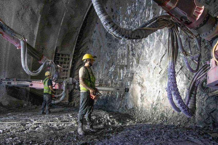 8月17日,在秭归县九畹溪镇房五高速佛照山隧道内,中铁隧道局工人进行施工作业。