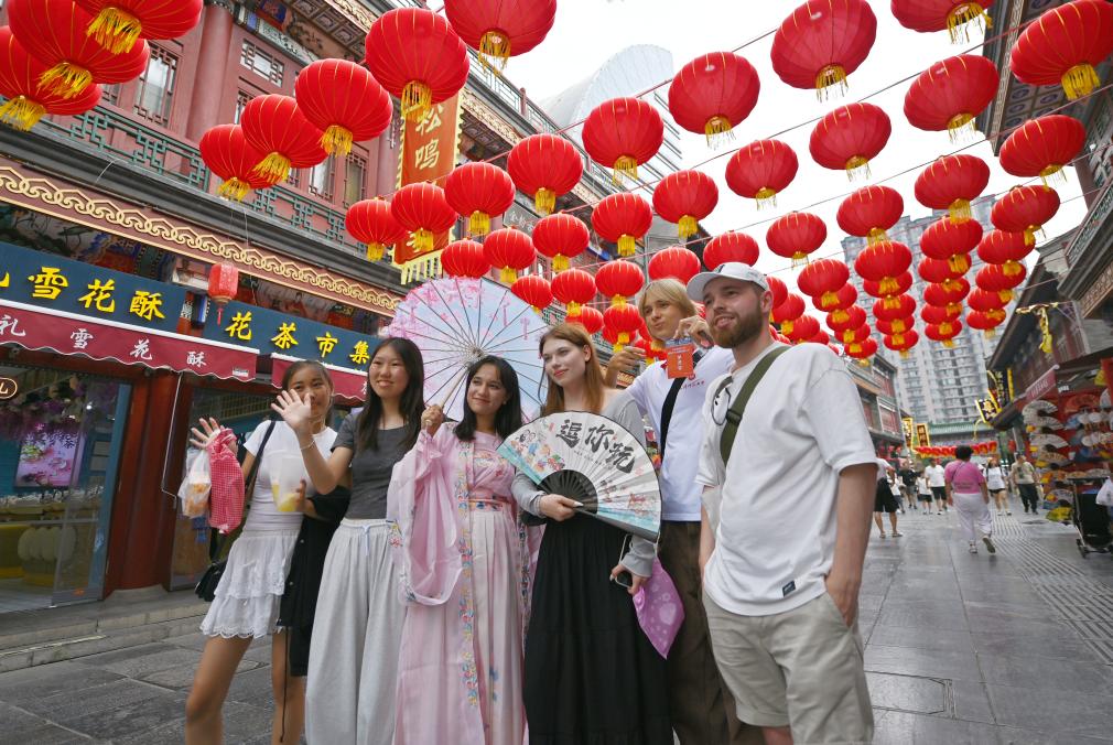 8月14日,上合组织国家学生在天津古文化街留影。新华社记者李然摄