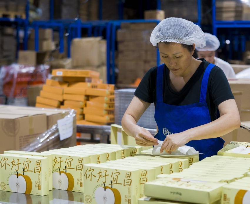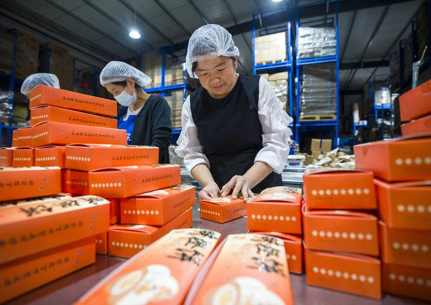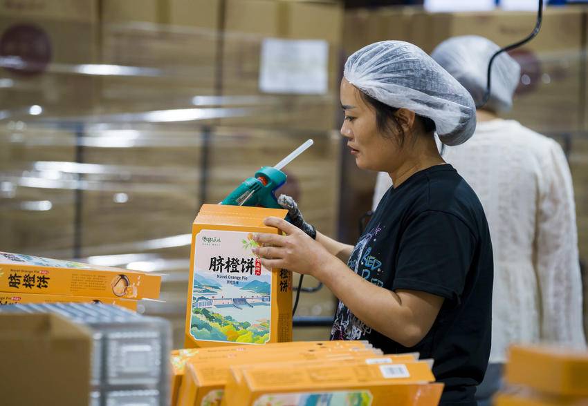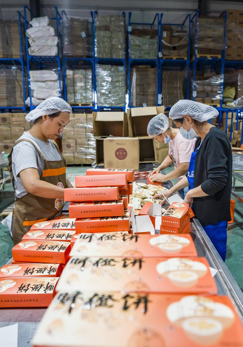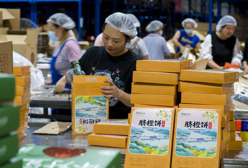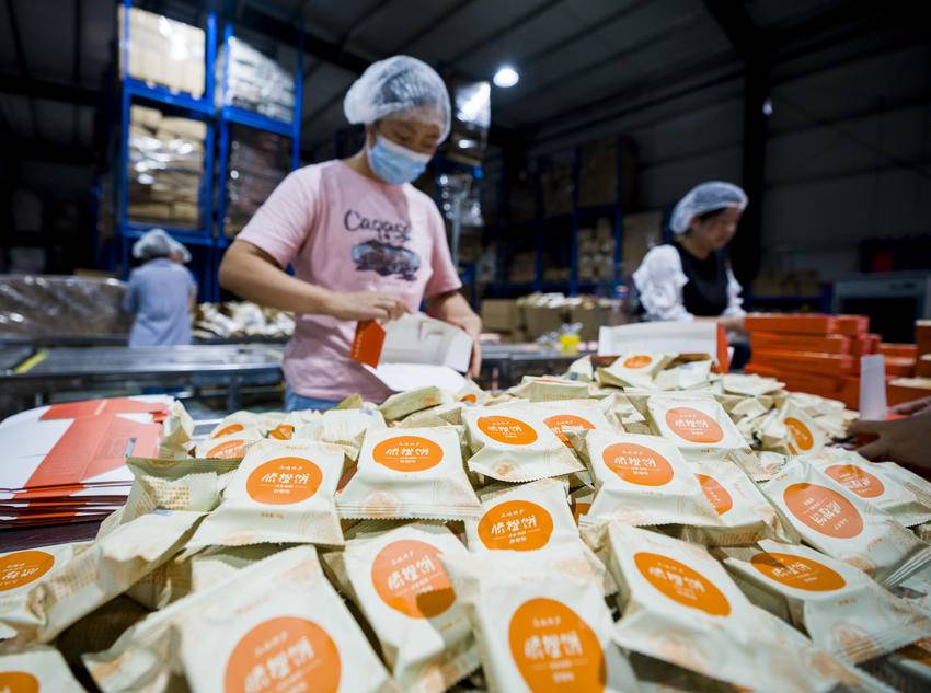 临近国庆与中秋,9月25日,湖北屈姑国际农业集团加紧对生产出来的脐橙月饼进行包装,供应节日市场。