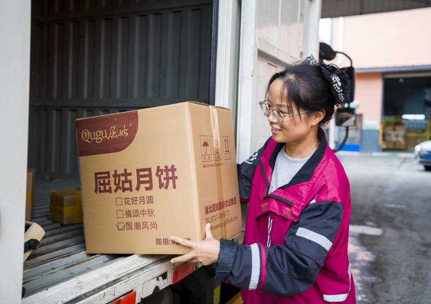 9月25日,快递员在揽收屈姑国际农业集团发出的脐橙月饼快递。