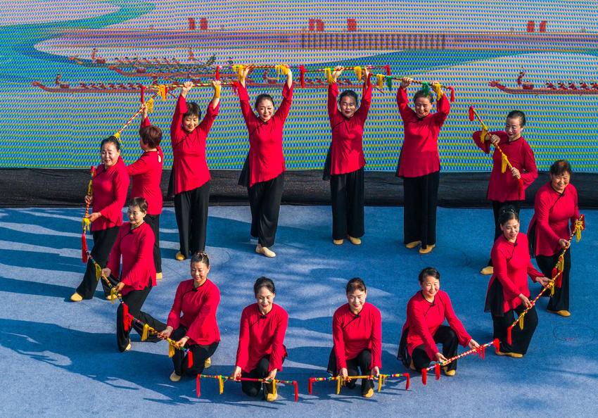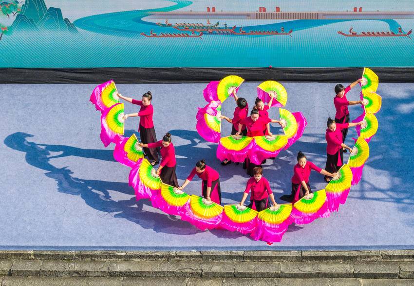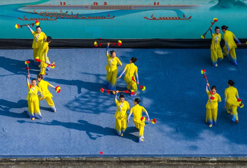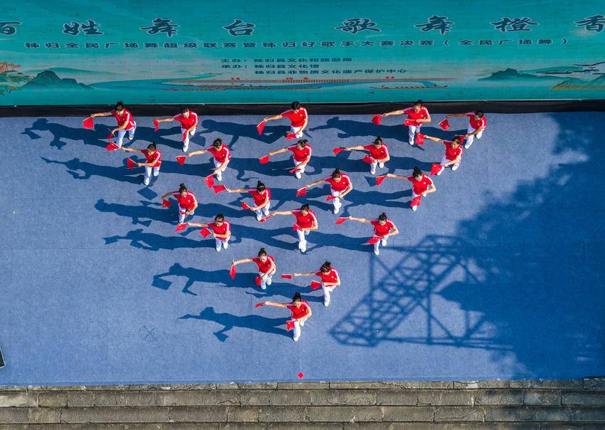 图为10月8日,参赛队伍在秭归县屈原故里景区南门广场进行广场舞决赛(无人机照片)。