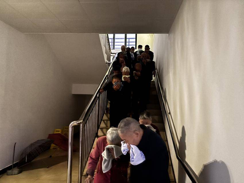 随着手动报警器触发,演练正式拉开序幕。火灾报警器控制器接收信号后,值班人员立即启动规范应急响应流程:灭火行动组迅速奔赴“火情”现场,全力压制初期火势;通讯联络组第一时间拨打报警电话,并安排专人在路口等候,确保消防救援队快速对接;疏散组工作人员引导院内人员用湿毛巾捂住口鼻、保持弯腰低姿,沿预设疏散通道向安全地带转移,各疏散组长逐间核查房间,确认无人员被困后及时清点人数;抢险救护组同步开展“伤员”转移模拟,规范完成“受伤人员”向指定医疗机构的转运工作。