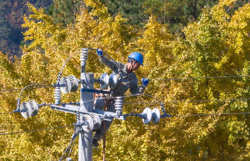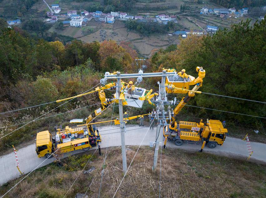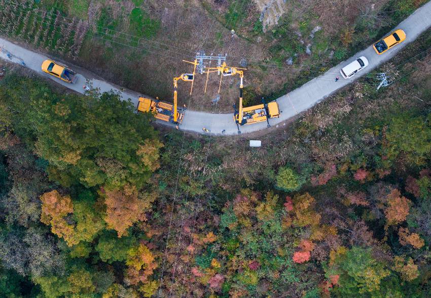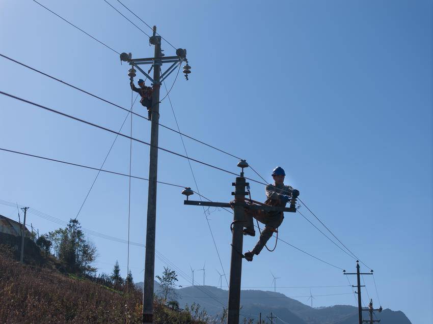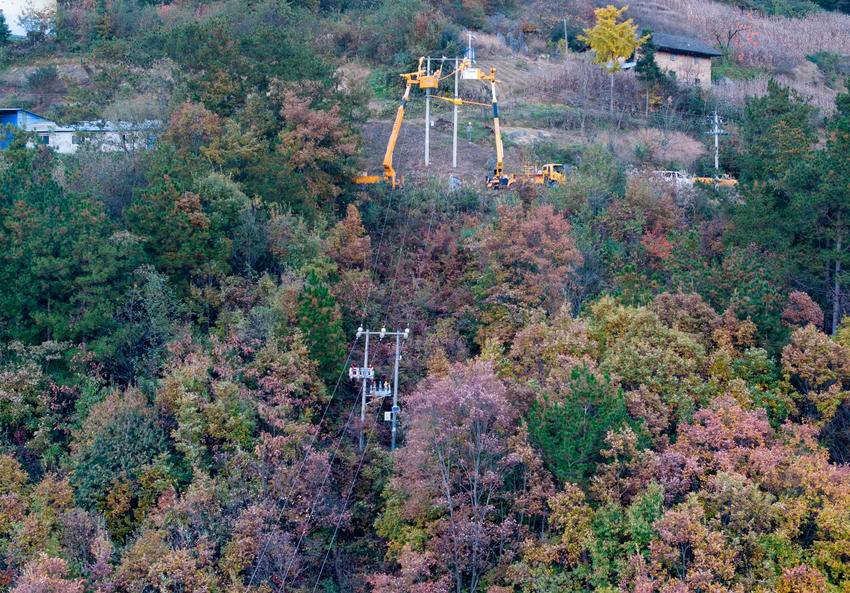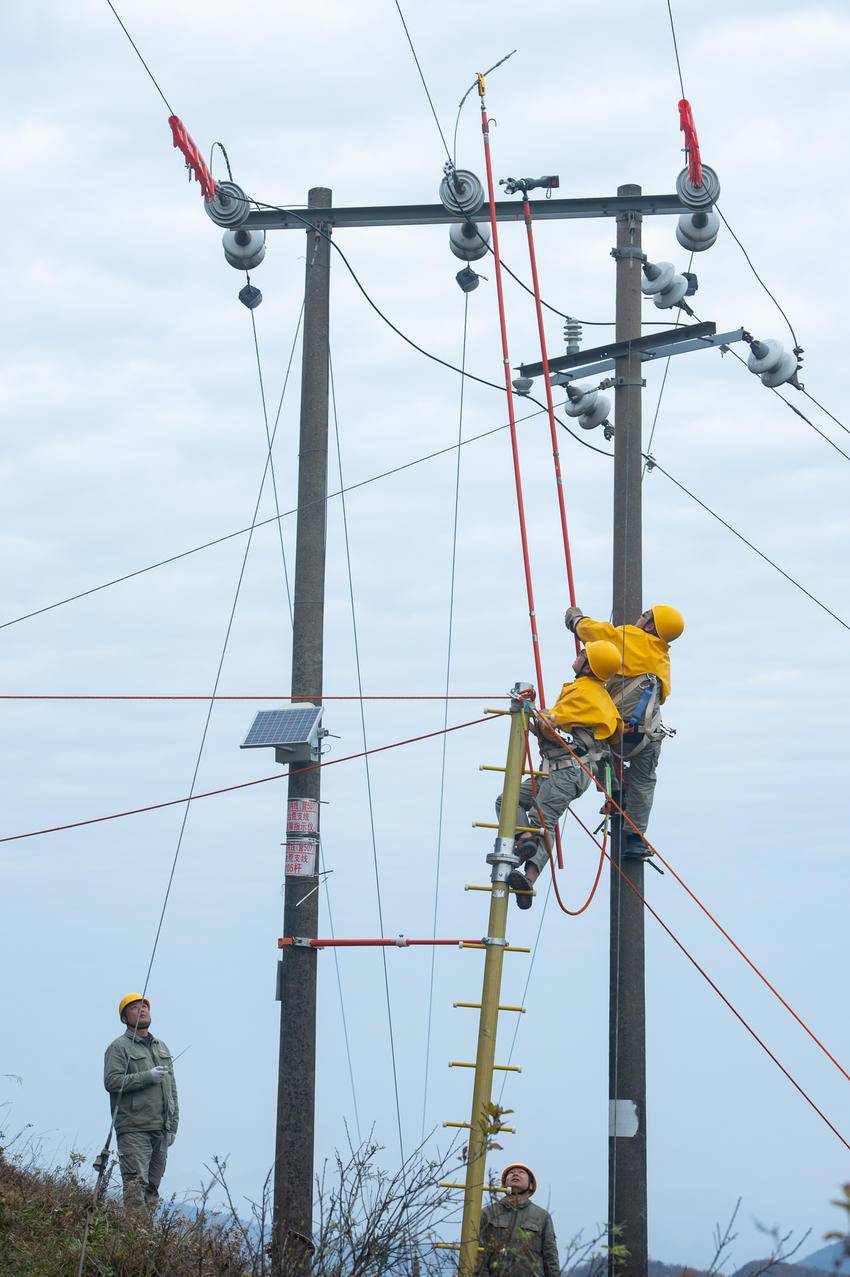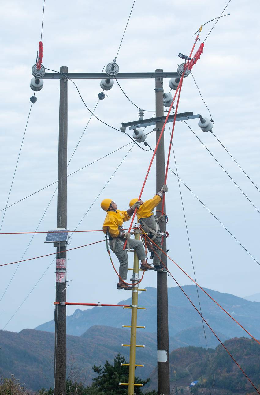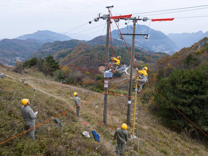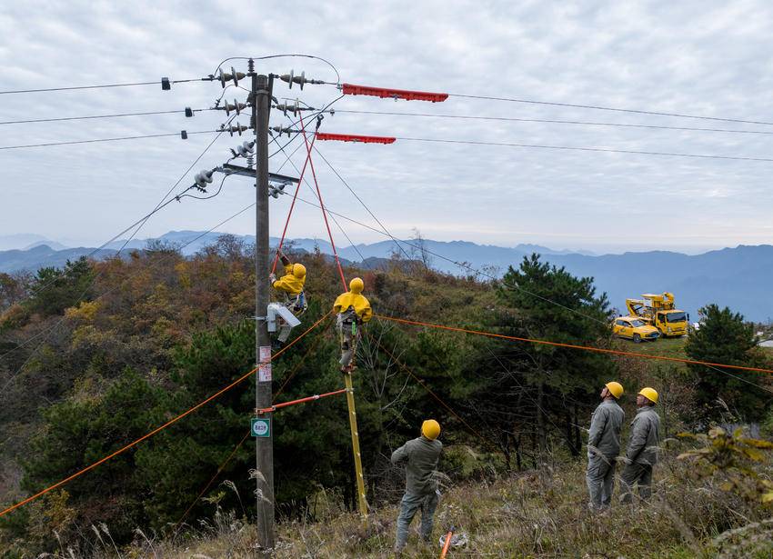 2025年11月13日,电力工人在湖北省宜昌市秭归县两河口镇月明山村10千伏云台荒线上作业。