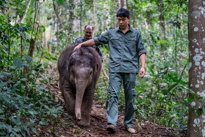 2024年12月8日,西双版纳亚洲象救护与繁育中心工作人员莫诗宇(右)、陈继铭带小象到野外开展训练。新华社记者 胡超 摄