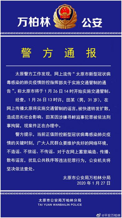 此外,26日当天,居住在山西太原市的31岁男子田某,在网上传播太原将实施交通管制的谣言,被快速转发扩散,造成恶劣社会影响。据山西省太原市公安局万柏林分局27日发布的警情通报介绍,田某已因涉嫌寻衅滋事犯罪被依法刑事拘留。
