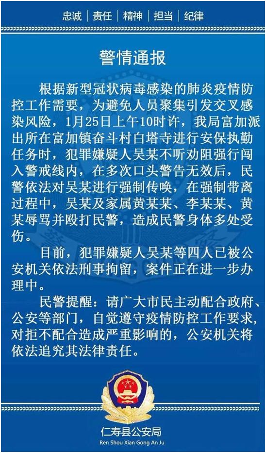 1月25日上午10时许,四川省仁寿县公安局富加派出所根据新型冠状病毒感染的肺炎疫情防控工作需要,为避免人员聚集引发交叉感染风险在富加镇奋斗村白塔寺进行安保执勤任务时,犯罪嫌疑人吴某不听劝阻强行闯入警戒线内,在多次口头警告无效后,民警依法对吴某进行强制传唤,在强制带离过程中,吴某及家属黄某某、李某某、黄某辱骂并殴打民警,造成民警身体多处受伤。目前,犯罪嫌疑人吴某等四人已被公安机关依法刑事拘留,案件正在进一步办理中。