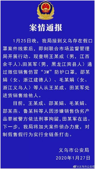 疫情来袭,防疫物资的供应成了关键。浙江省义乌市公安局官方微博27日发布一则警情通报介绍说,1月25日晚,该局接到义乌存在假口罩案件线索后,即刻联合市场监督管理局开展行动。现查明王某成(男,江西余干人)、田某军(男,黑龙江宾县人)通过微信销售仿冒“3M” 防护口罩,邵某娟(女、浙江建德人)、毛某娟(女、浙江义乌人)等人从王某成、田某军处进货销售给他人。目前,王某成、邵某娟、毛某娟、邵某燕、鲁某科等人因涉嫌销售伪劣产品罪被警方依法刑事拘留,田某军在逃。下一步,义乌市公安局将加大案件侦办力度,对制假售假行为实行全链条打击。