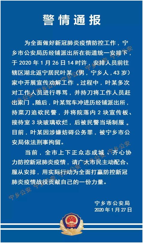同样在26日,湖南宁乡市公安局历经铺派出所为全面做好新冠肺炎疫情防控工作,于当天下午2点左右,安排人员前往辖区湖北返宁居民叶某家开展宣传劝解工作。但叶某在过程中对工作人员进行辱骂,持刀将他们赶出家门。随后,他还驾车冲进派出所,持菜刀追砍民警,后被民警当场制服。目前,叶某因涉嫌妨碍公务罪,被宁乡市公安局依法刑事拘留。