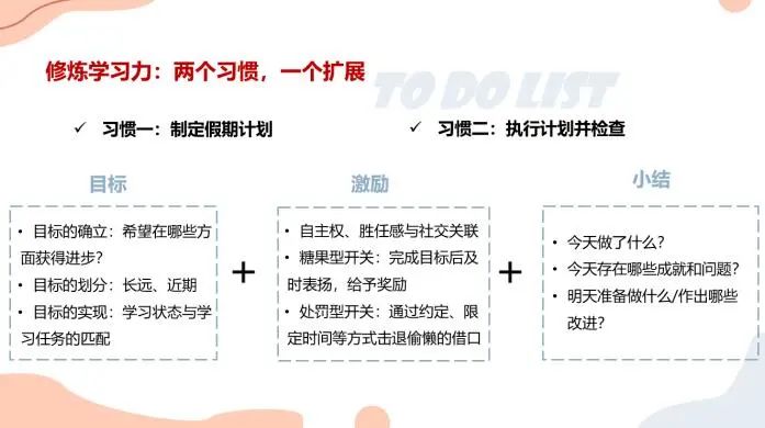①明确目标。目标贵精不贵多,选择一个最重要的目标作为假期努力的大方向。