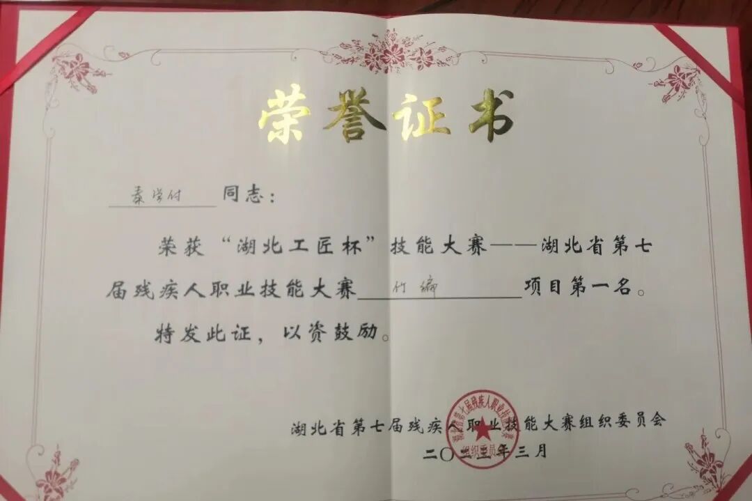 3月1日至3月3日,2022年湖北工匠杯技能大赛——第七届湖北省残疾人职业技能大赛在武汉举行。宜昌市代表队17名选手参加竹编、插花、皮革护理等25个项目。秭归县选手秦学付获竹编第一名!