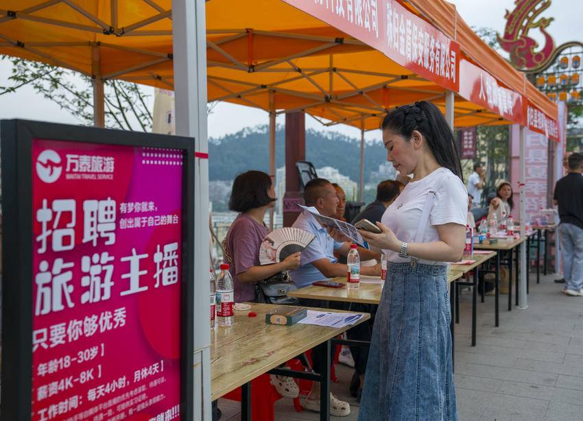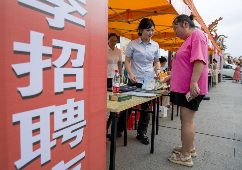 7月12日,秭归县九歌巷子夜市,人社局工作人员为求职者科普就业创业政策信息。