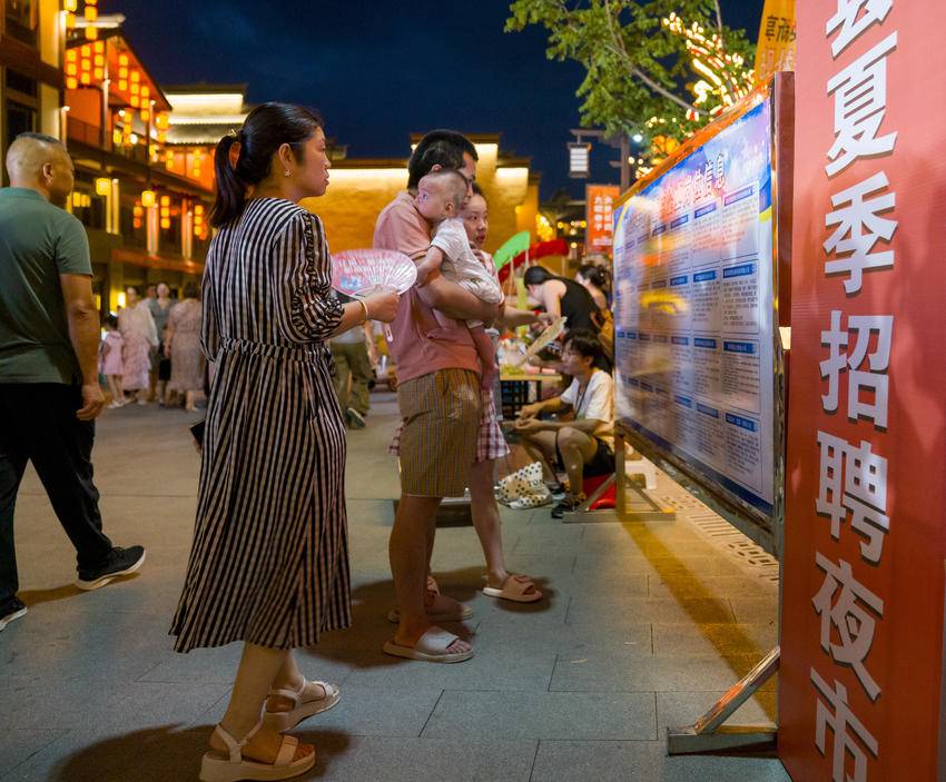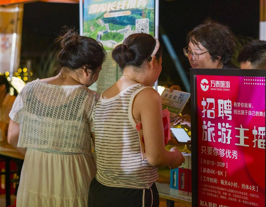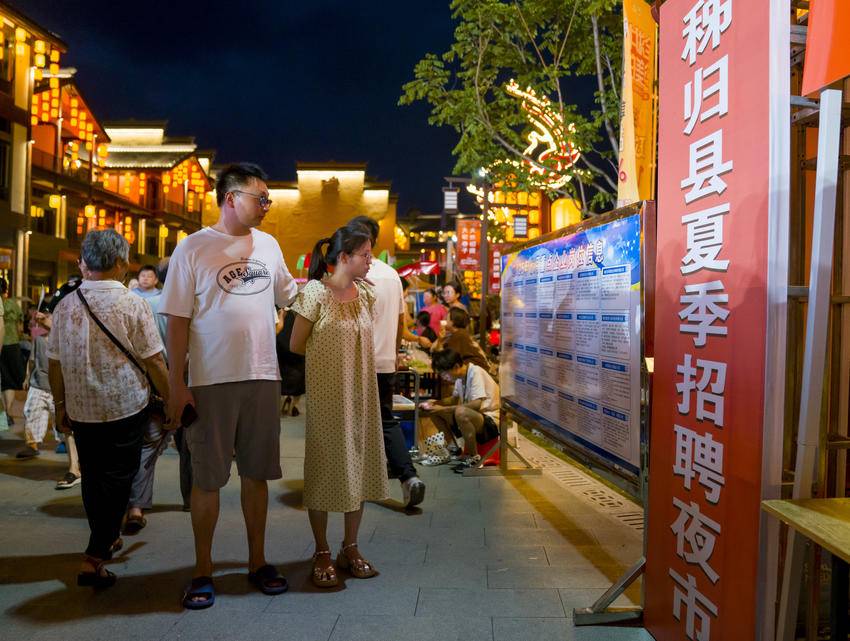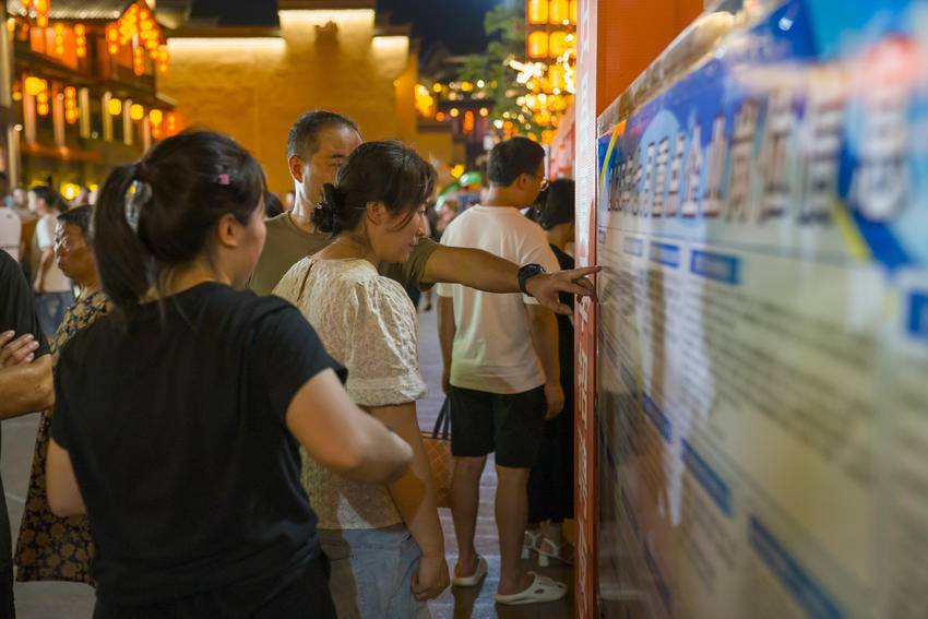 7月12日,秭归县九歌巷子夜市,求职人员查看不同岗位信息。