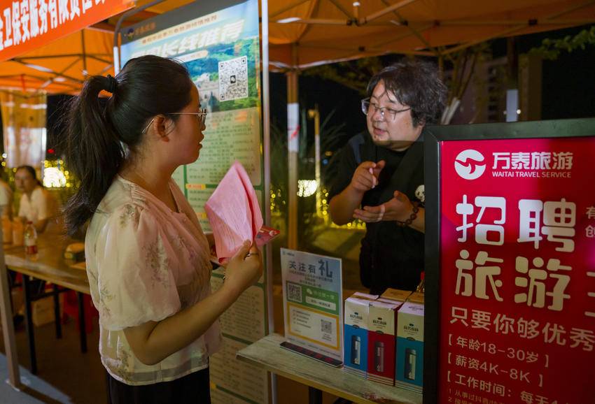 7月12日,秭归县九歌巷子夜市,企业招聘专员与应聘人员交流岗位信息。