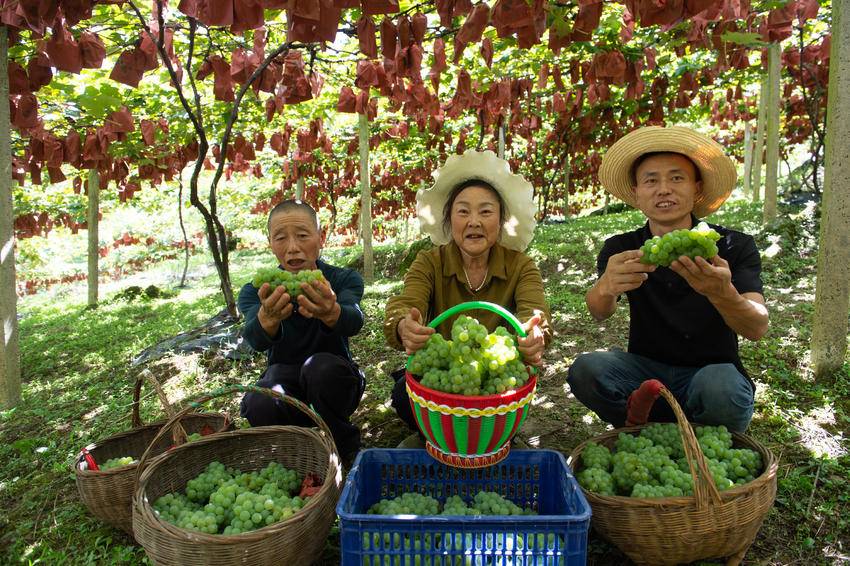 8月13日,游客和村民在秭归县磨坪乡水晶葡萄园展示采摘的新鲜葡萄。