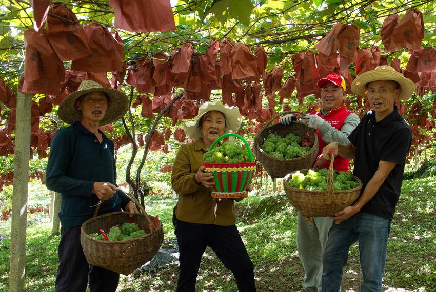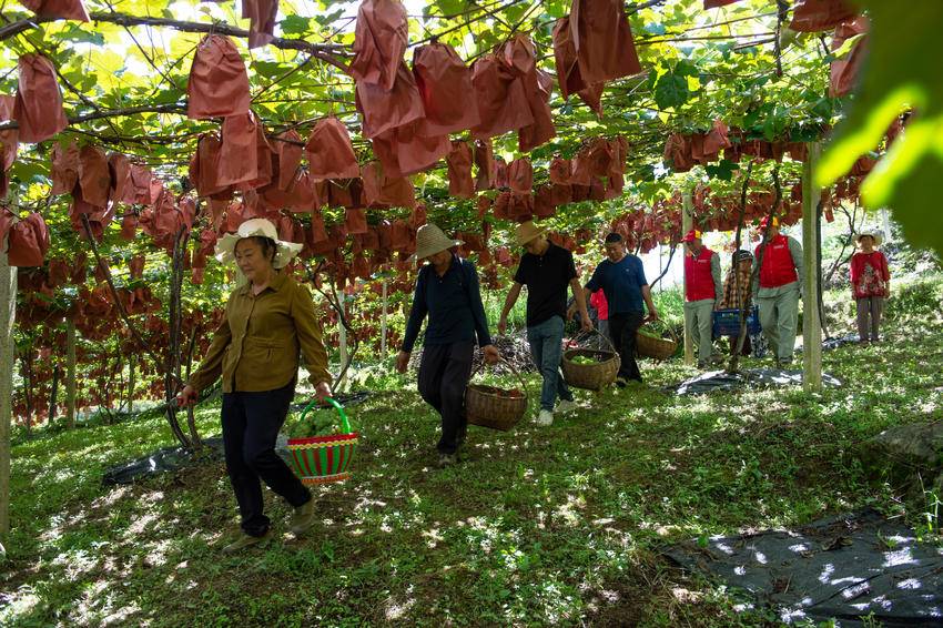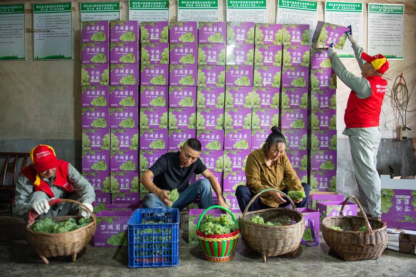 时下,在湖北省秭归县磨坪乡100亩葡萄进入成熟季。万鸿农产品商贸有限公司组织村民集中采摘、包装、果园直播、外运,通过线上线下和自驾游产地直销等方式供应市场。