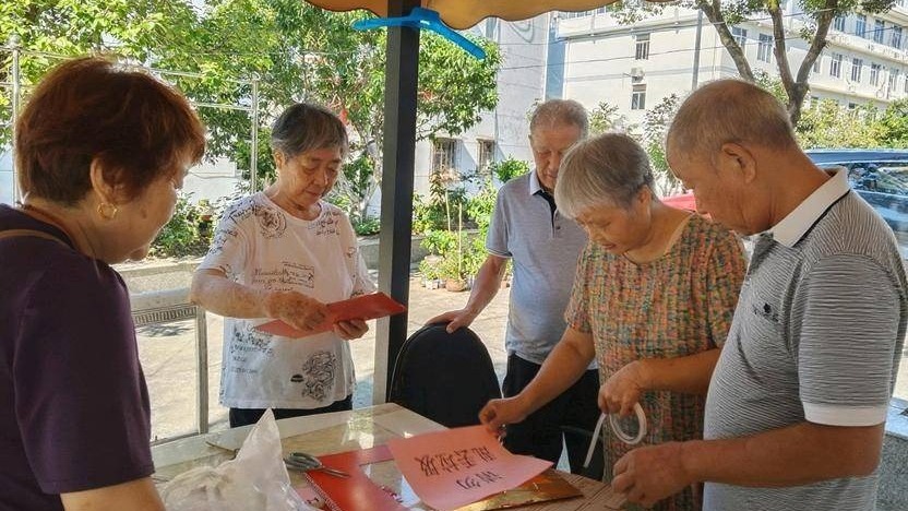 看到提示语的居民格外开心,主动找来硬纸板、剪刀和透明塑封袋,围在一起分工协作,裁剪纸板、书写提示语、用透明袋塑封加固,齐心协力制作提示牌,最后一起将做好的提示牌整齐粘贴在停车带旁的树干上,用双手为小区环境“站岗”。