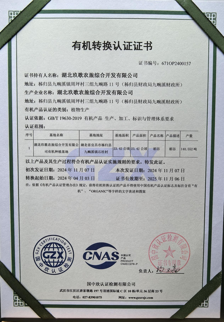 “我们申请有机认证,不仅仅是为了一个证书,更是对我们走绿色发展道路的坚定承诺。我们希望让更多的人品尝到来自长江三峡畔、源自青山冷水泉的健康好米,共享生态农业发展的成果。”玖歌国有公司总经理刘宏群表示。