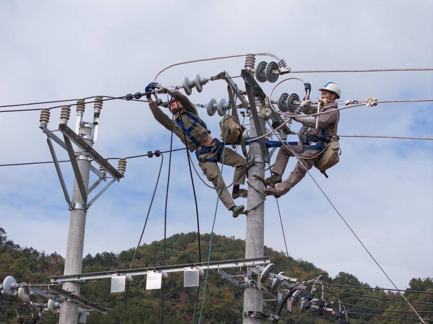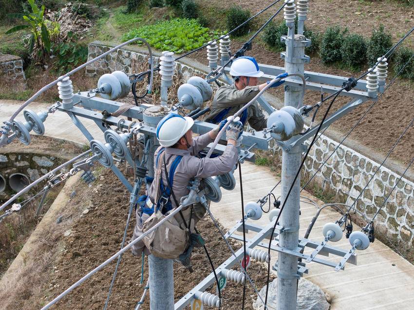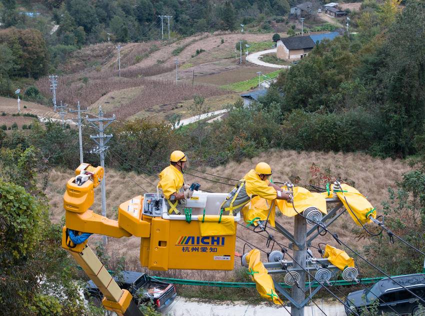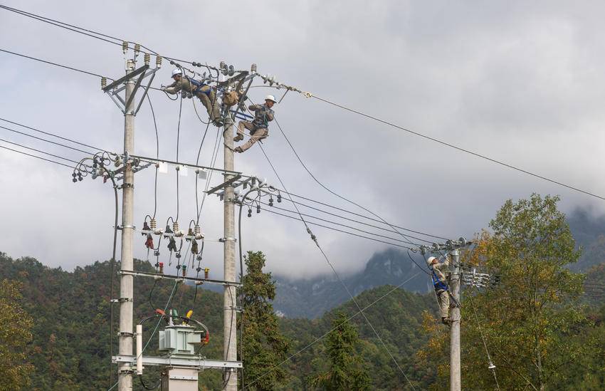 2025年11月11日,电力工人在湖北省秭归县磨坪乡雁落坪村10千伏升磨线上施工。