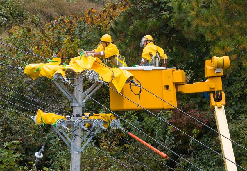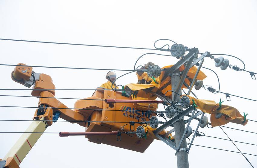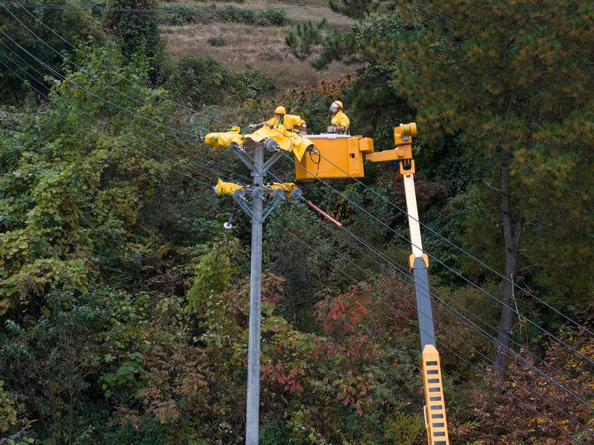 2025年11月11日,电力工人在湖北省秭归县磨坪乡雁落坪村10千伏升磨线上进行带电作业。