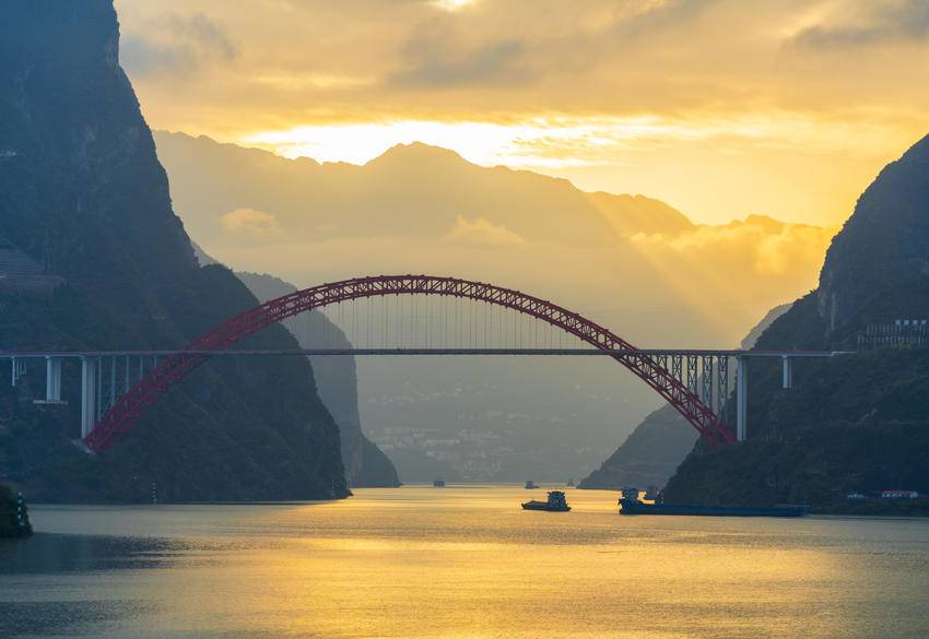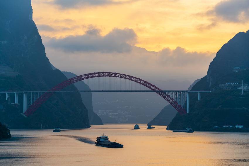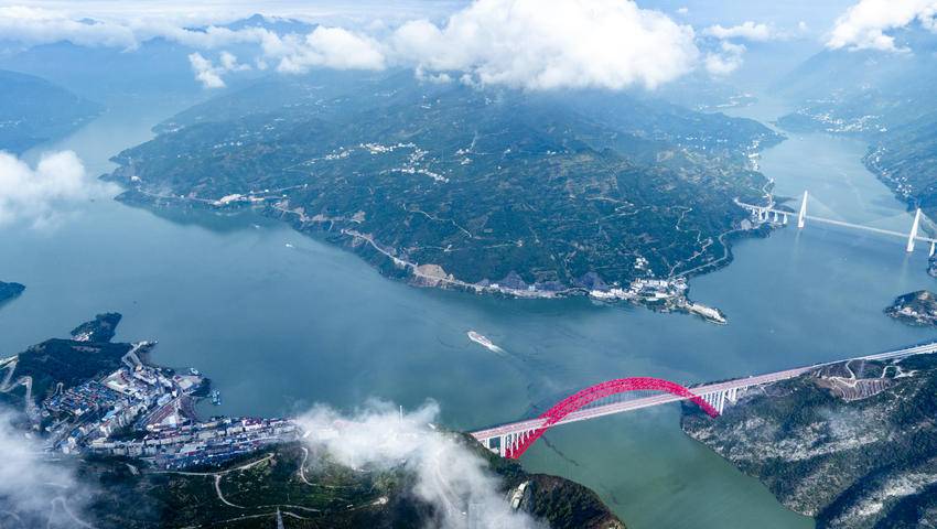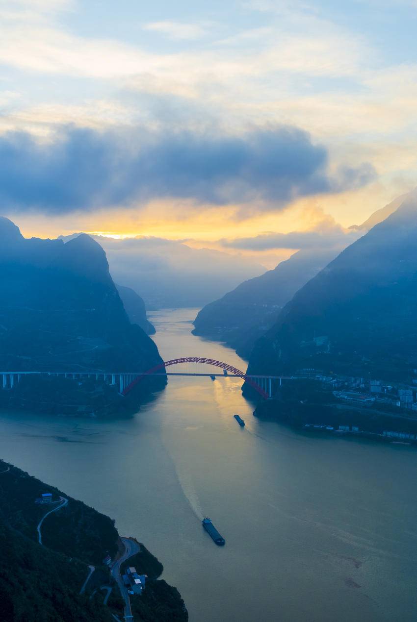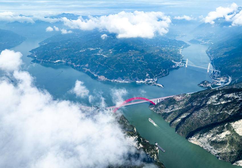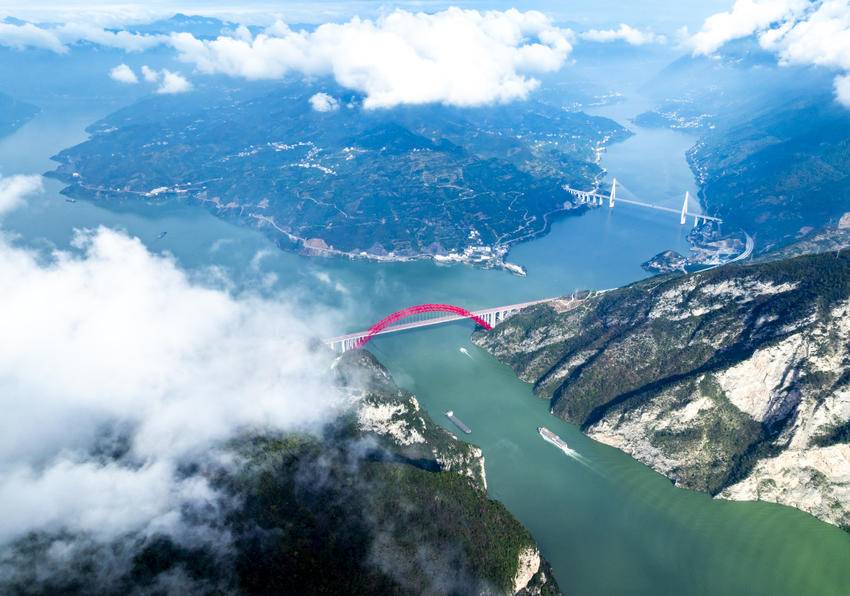 11月11日,湖北省宜昌市秭归县,秭归长江大桥飞跨长江,水运船舶与公路大桥交相辉映,构成一幅乡村振兴的美丽画卷。