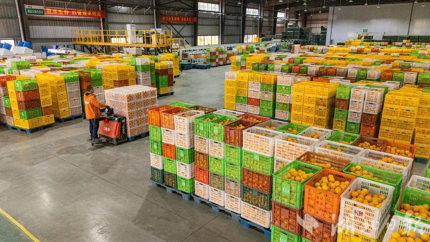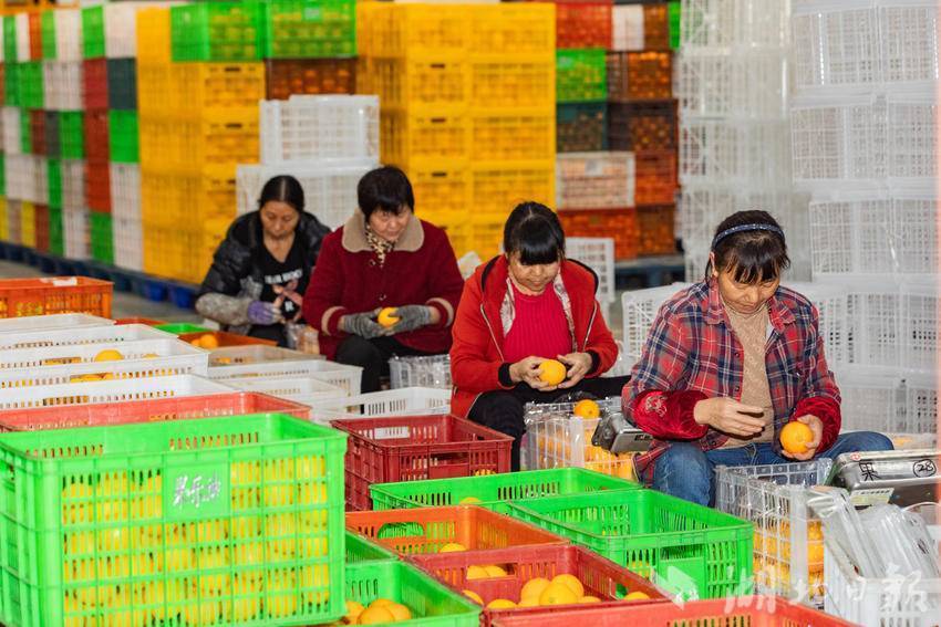 2025年11月24日,宜昌市果乐迪食品有限公司鲜果加工车间内,工人们正在分拣转运鲜橙。(彭强摄)