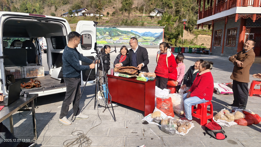 当天下午,冬日暖阳洒满石柱村委会,现场人头攒动,热闹非凡。村委会小广场上琳琅满目地陈列着村民亲手制作的榨广椒、香椿、腊肉、咸菜、豆豉、干豇豆、干土豆、萝卜干、山野菜等特色农产品。在主播的引领下,村民们于直播镜头前热情洋溢地推介自家产品,巧妙运用新学的电商技巧,生动讲述乡村故事。直播现场气氛热烈,网友互动踊跃,订单量节节攀升,不仅为石柱村农产品开辟了广阔销路,更让山货跨越群山,跃上城市餐桌。