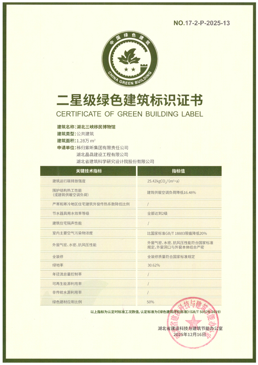 近日,湖北省建设科技与建筑节能办公室正式向湖北三峡移民博物馆颁发“二星级绿色建筑标识证书”,标志着这座承载着三峡移民历史记忆的重要文化地标,在绿色低碳发展道路上迈出了坚实一步,成为秭归县首个践行“双碳”战略的标杆项目。