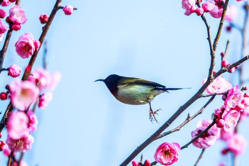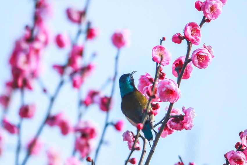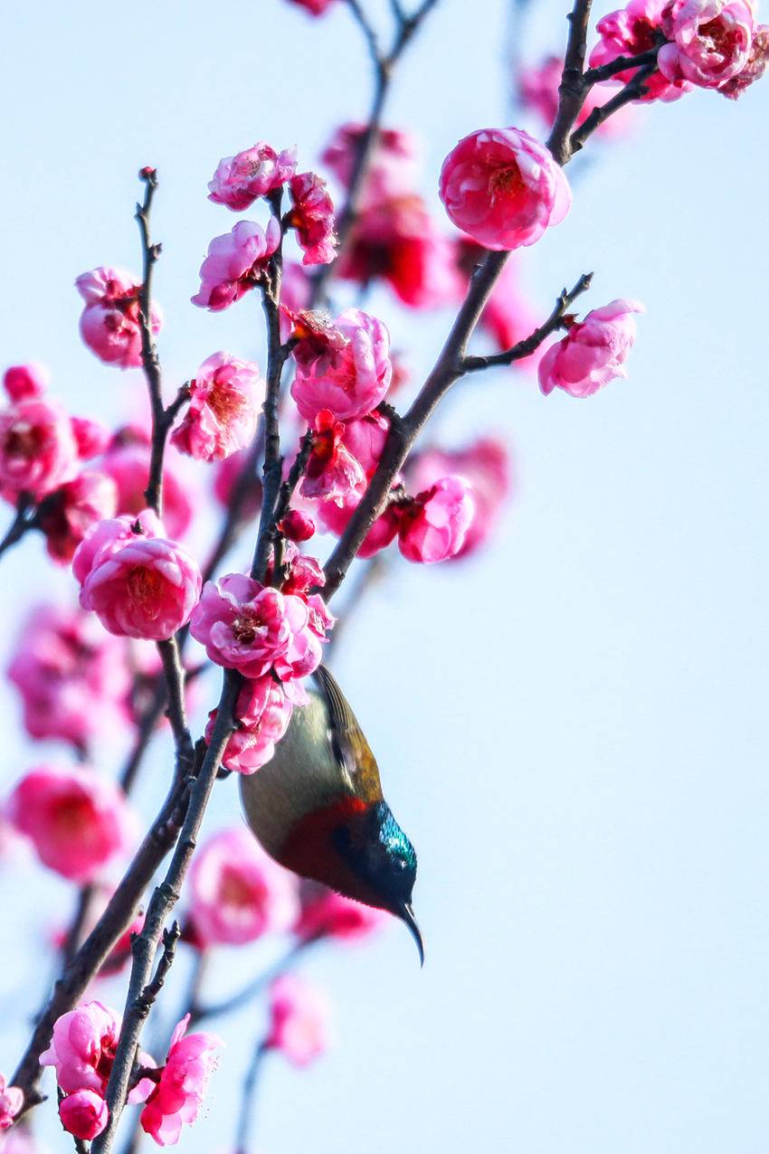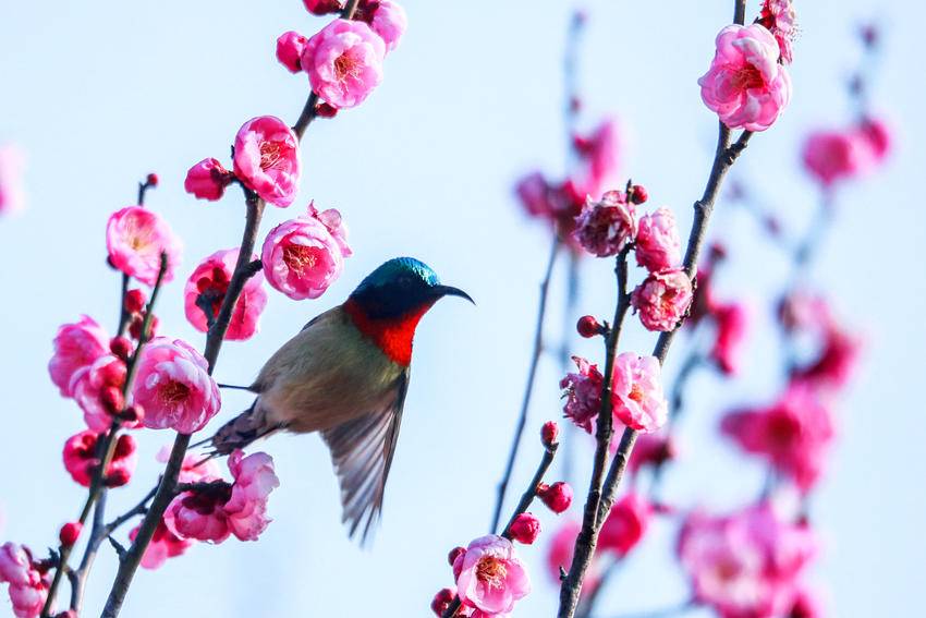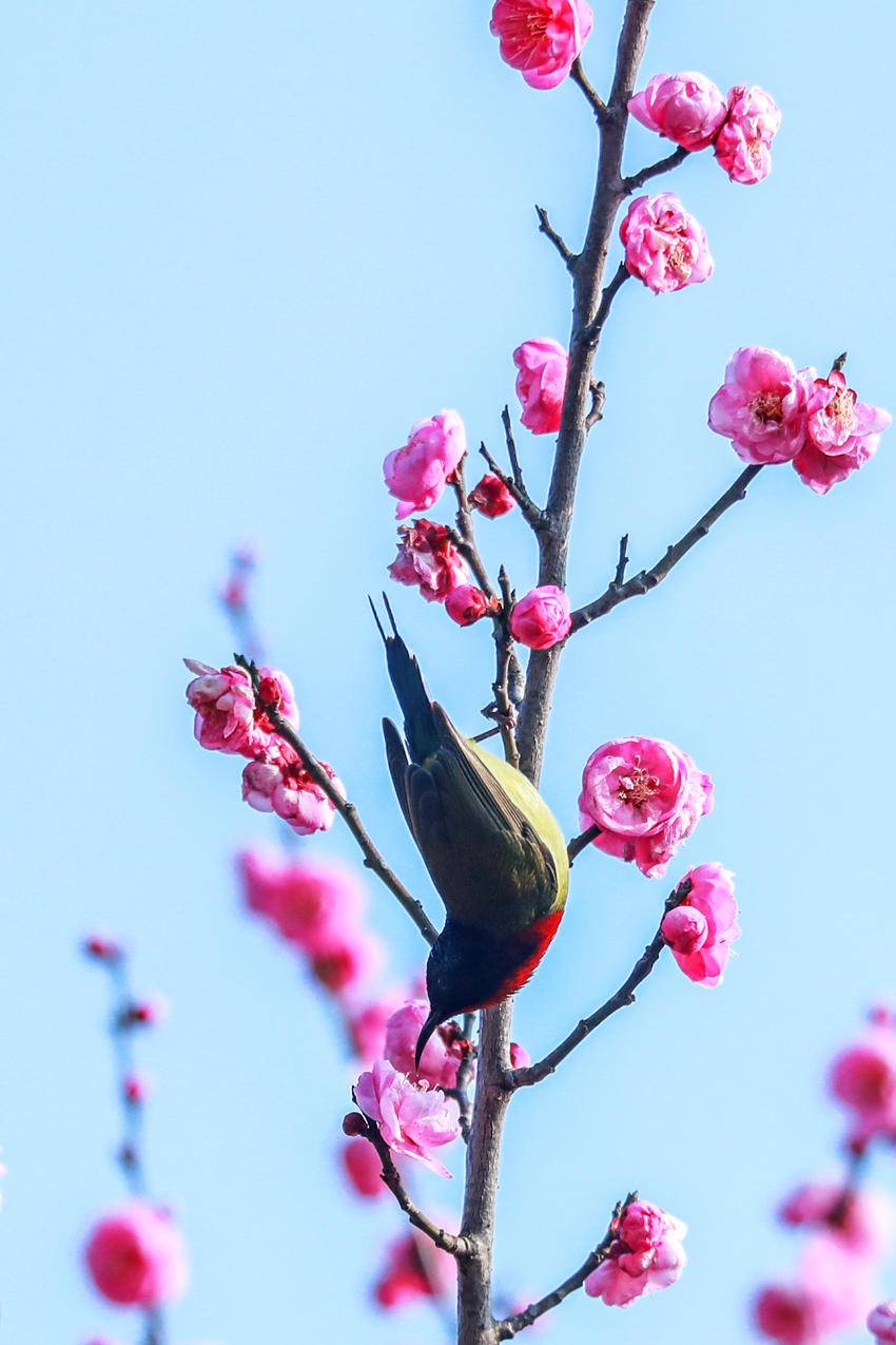 时下,三峡大坝附近湖北省宜昌市秭归县的红梅次第绽放,馨香四溢,各种小鸟在花枝间飞舞嬉戏,令人心旷神怡。 图为1月13日,叉尾太阳鸟在秭归县屈原故里景区红梅花枝间觅食嬉戏。 (来源:王罡) 责任编辑:肖飞 值班编辑:吕梦川