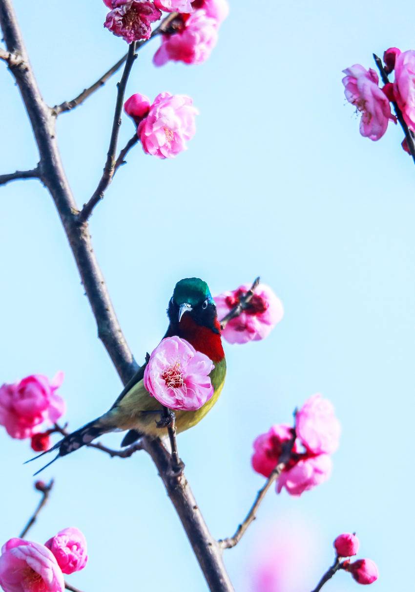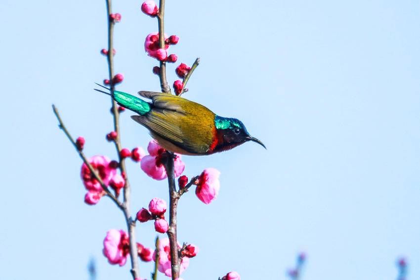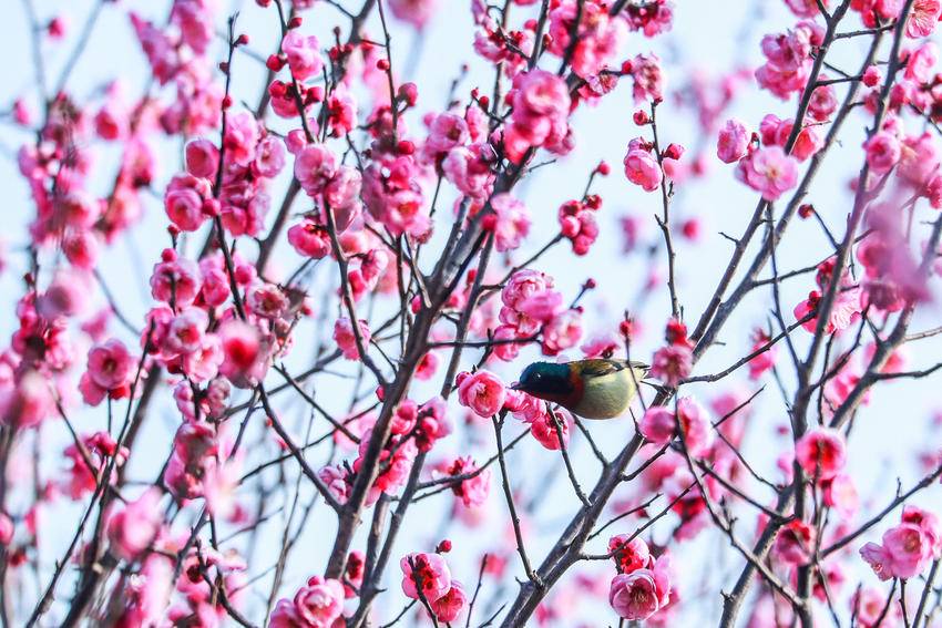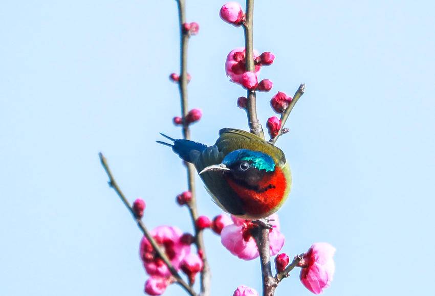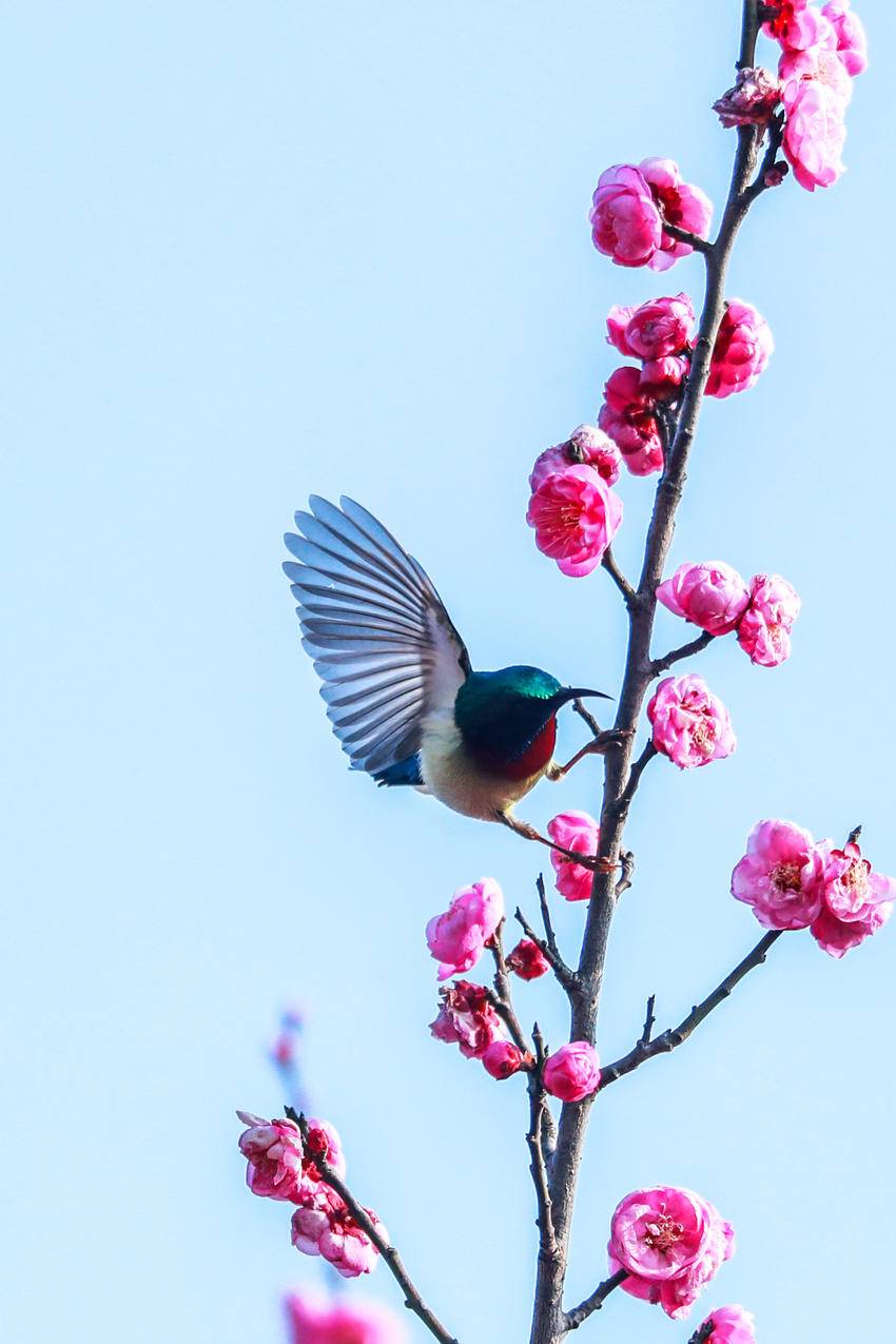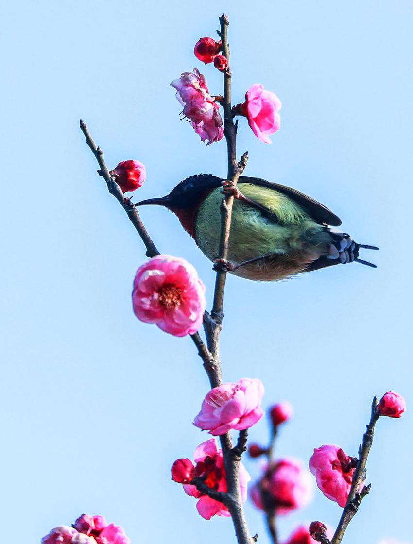 时下,三峡大坝附近湖北省宜昌市秭归县的红梅次第绽放,馨香四溢,各种小鸟在花枝间飞舞嬉戏,令人心旷神怡。 图为1月13日,叉尾太阳鸟在秭归县屈原故里景区红梅花枝间觅食嬉戏。 (来源:王罡) 责任编辑:肖飞 值班编辑:吕梦川