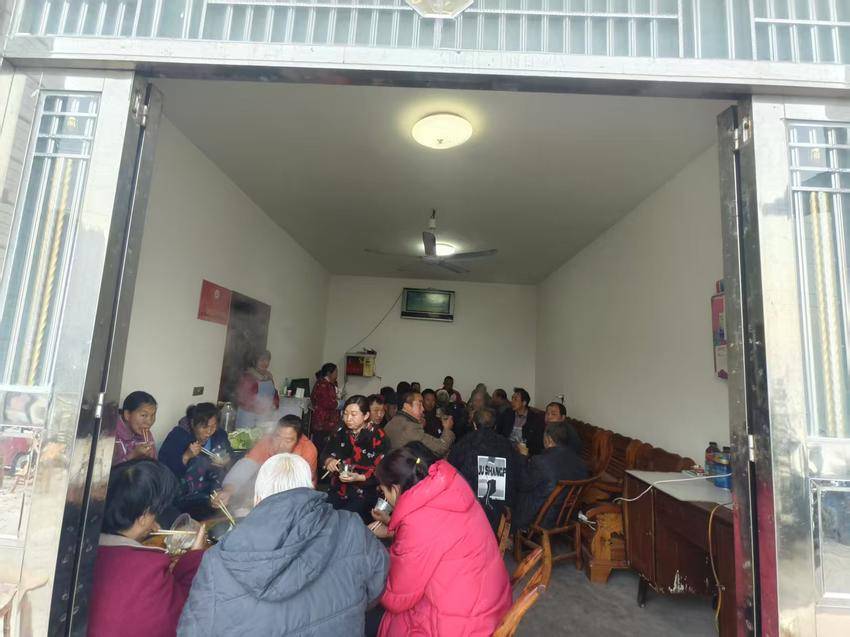 圆桌上菜肴丰盛:鲜嫩的炒猪肝、软糯的红烧肉、清爽的时令蔬菜……老人们围坐在一起,吃得津津有味。村干部也借此机会与大家交谈,了解生活近况,并宣传冬季用火用电安全知识。