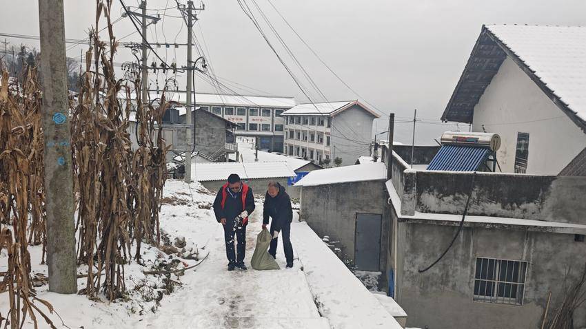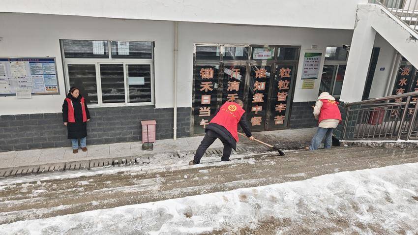 下午2时30分,在校领导统一组织下,教师们自带扫帚、铁锹等工具,身着统一红色工作马甲,按预先划分的责任区域迅速投入清扫工作。大家不畏严寒,配合默契,重点对校门口主干道、教学楼前后通道、食堂周边及台阶坡道等区域进行彻底清理和防滑处理。
