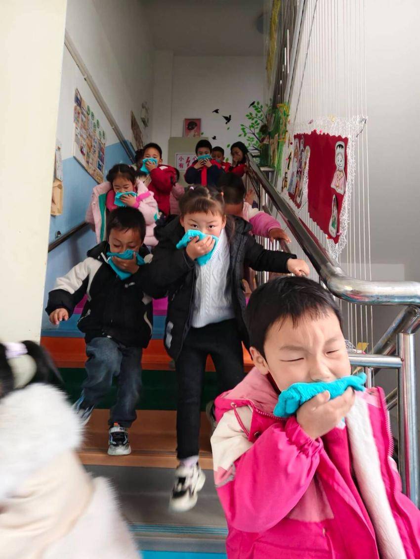 演练前,该园班主任组织开展消防主题教育,讲解消防逃生要领和演练方法。警报声响起后,该园一百多名幼儿迅速用湿毛巾捂住口鼻、弯腰低姿,沿预定路线快速有序撤离,引导老师在楼梯口、转角处值守,保障撤离安全。全体人员仅用了2分钟就抵达操场指定区域,各班立即清点人数并报告,无一人遗漏。随后,该园园长现场讲解火灾预防、报警流程与火场逃生知识,回班后老师通过绘本及宣传片讲解干粉灭火器“提、拔、握、压”的操作方法。