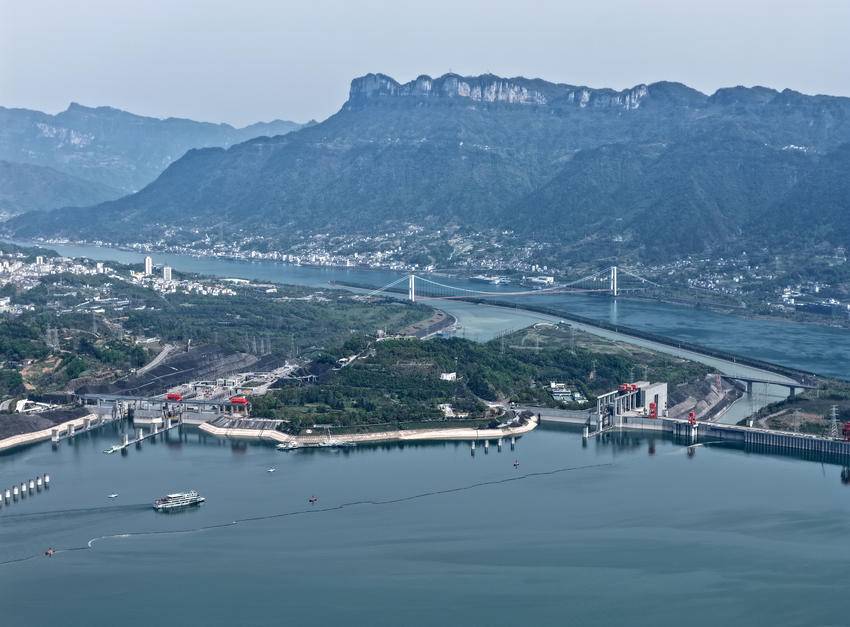 4月3日,在湖北省宜昌市,长江三峡号游轮行驶在三峡大坝坝前水域(无人机照片)。