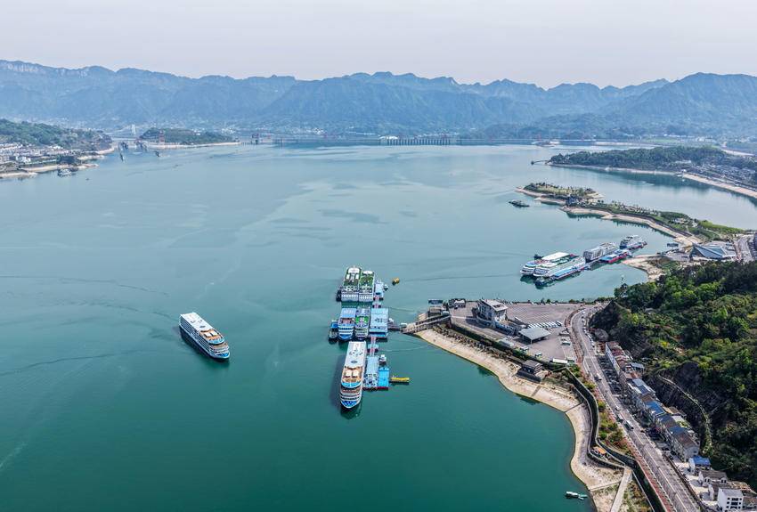 4月3日,在三峡大坝坝前湖北省宜昌市秭归县拍摄的繁忙的秭归旅游港(无人机照片)。